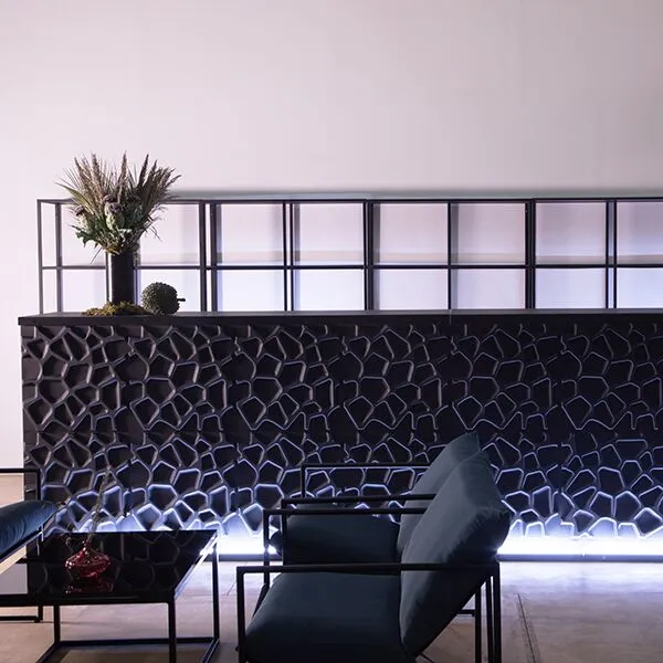 Sustainably designed and created by us a beautiful foldable bar with an internal shelf. This bespoke bar fascia is constructed from 3D geometric black recycled cardboard Slide 2 bars together for seamless 4m long-bar.