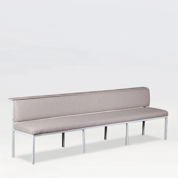 A stunning graceful and timeless bench with a backrest. Upholstered in a luxury sunbrella linen weave for an in/out experience. The metal frame is finished in Clay Grey a supports a wood slatted ledge. The lush, soft padding promises the highest level of seating comfort. Up-cycled by HI. Design.
