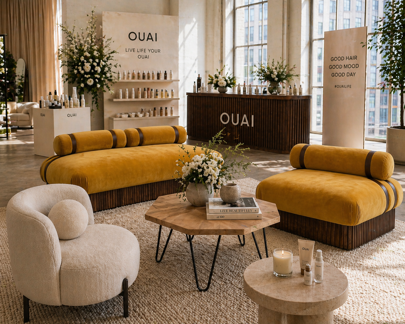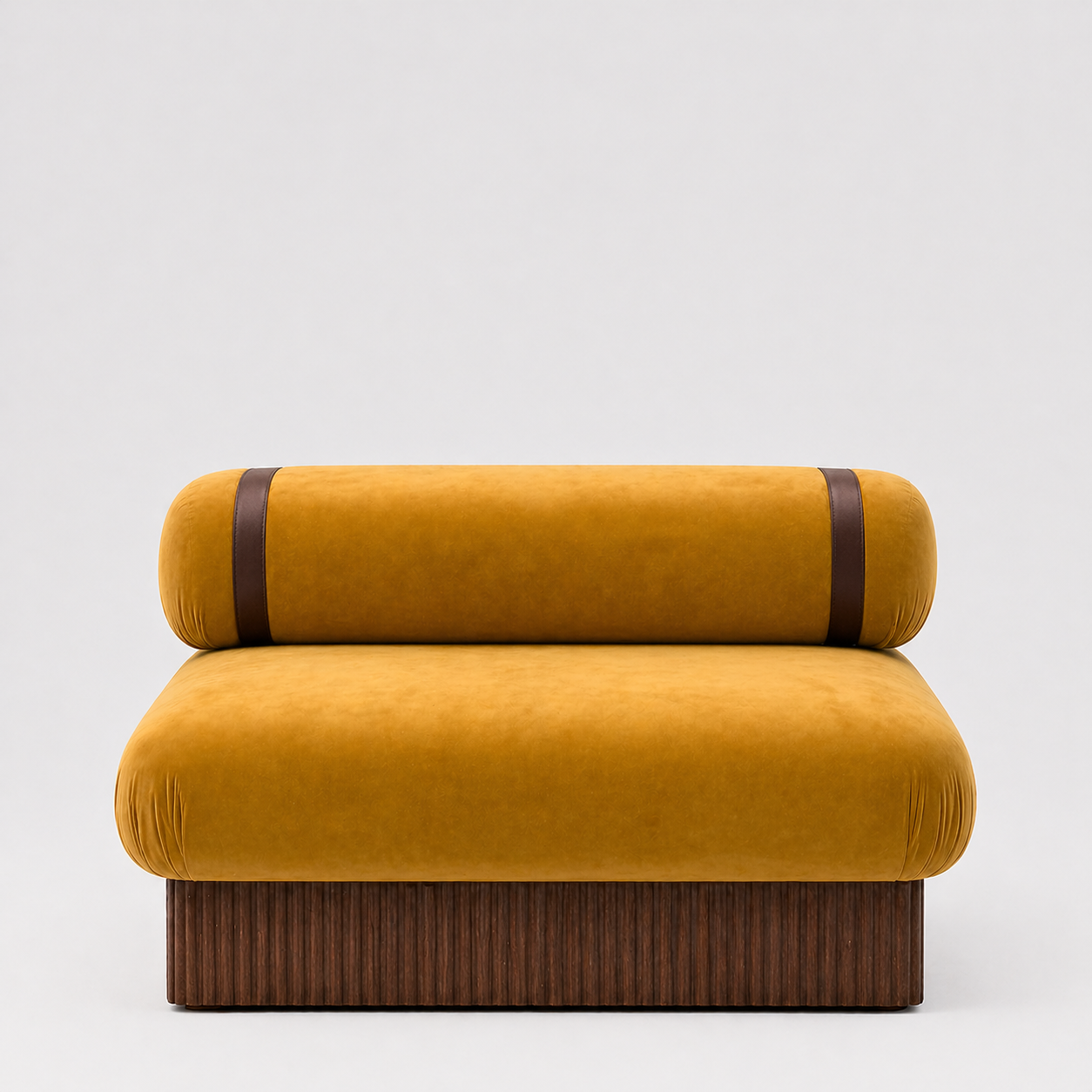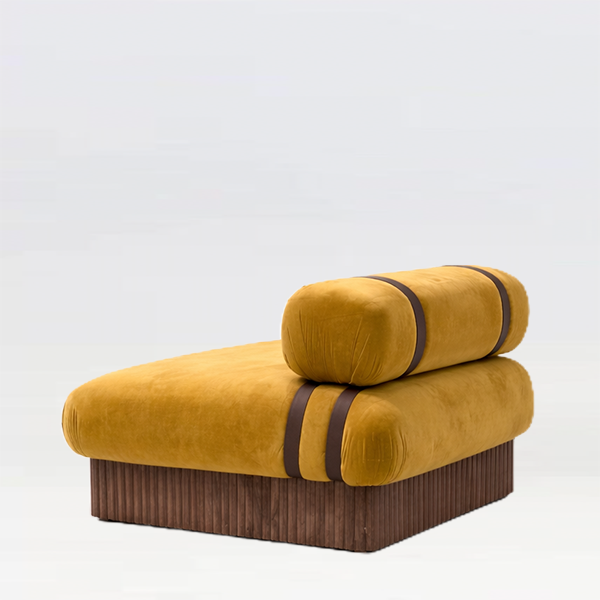 Designed and handcrafted in London by our HI Design team, the Bougie Rockstar velvet armchair showcases plush mustard velvet, statement strap detailing, and a sculptural wooden base. Made from 100% reclaimed materials, this sustainable luxury armchair delivers high-end, modular seating that’s perfect for stylish brand events, experiential spaces, and premium lounge environments.