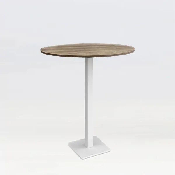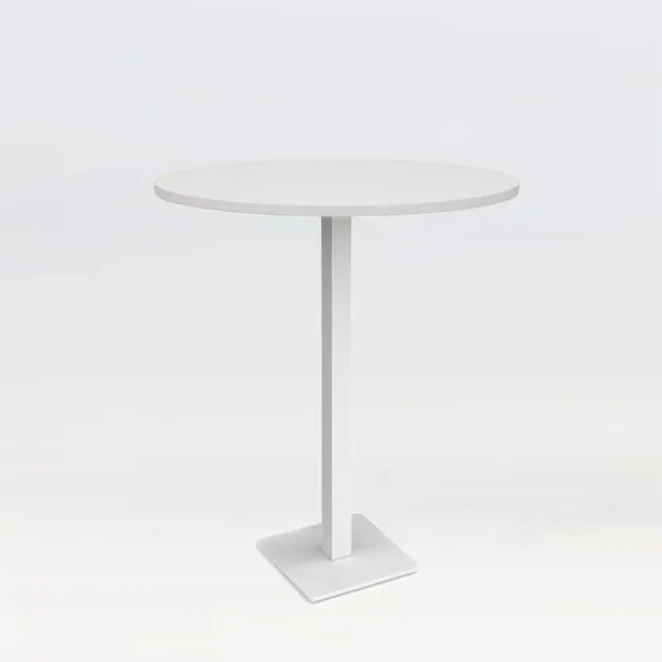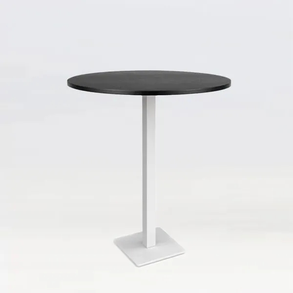 Flux poseur table. Flat square steel base plate, with adjustable feet for uneven floor surfaces. which is assembled to the steel column holding various tops, square or round. see our selection