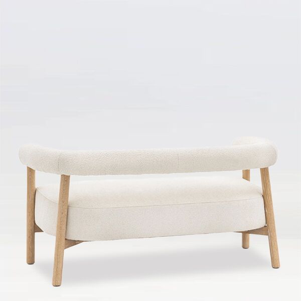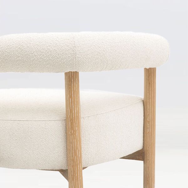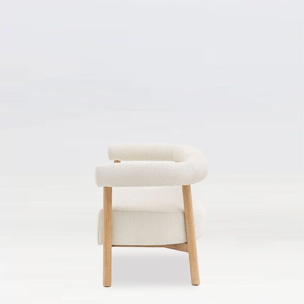 The Scandi Sofa. A stylish lounge chair with a minimalist design, featuring a cozy, boucle-upholstered seat and backrest supported by sturdy wooden legs.